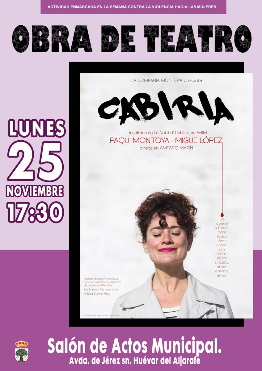 Con motivo de la semana contra la Violencia hacia las Mujeres, el próximo lunes, 25 de noviembre, en el Salón de Actos Municipal se representará la obra de teatro CABIRIA a las 17:30 horas.